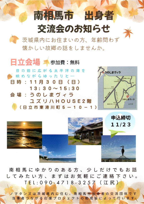 南相馬市出身者 交流会のお知らせ 茨城県内にお住まいの方、年齢問わず懐かしい故郷の話をしませんか。 目の前に広がる太平洋の海を眺めながらゆったりと… ■日時:11月30日(日)13:30~15:30 ■会場:うのしまヴィラ ユズリハHOUSE2階 (日立市東滑川町5-10-1) ■参加費:無料 ■申込〆:11/23 南相馬にゆかりのある方、少しだけでもお話してみたい方、...