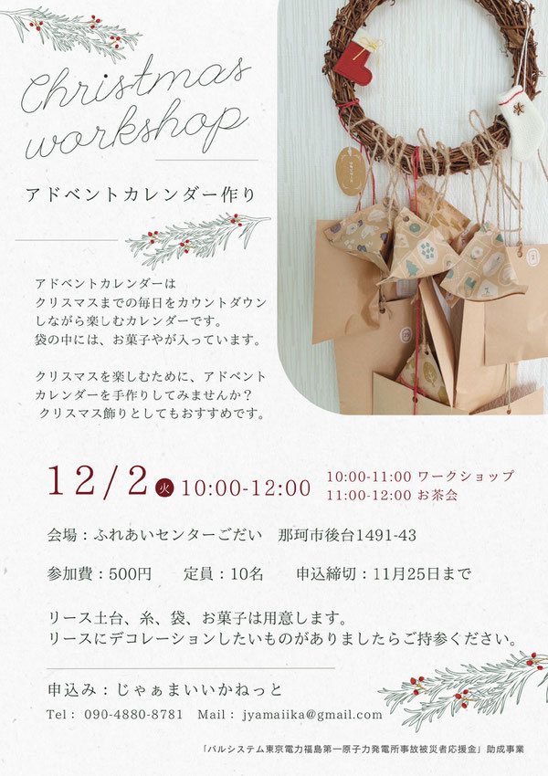 アドベントカレンダー作り アドベントカレンダーはクリスマスまでの毎日を カウントダウンしながら楽しむカレンダーです。 袋の中には、お菓子やが入っています。 クリスマスを楽しむために、アドベントカレンダー を手作りしてみませんか? クリスマス飾りとしてもおすすめです。 ■日時 12/2 火 10:00-12:00 10:00-11:00 ワークショップ 11:00-12:00 お茶会...