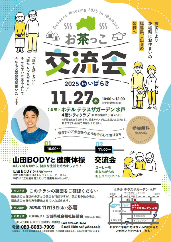 【お茶っこ交流会 2025 in いばらき】 「誰かと話したい」 「誰かとつながりたい」 そんな思いにお応えして今年も交流会を開催いたします ■日時 11月27日(木) 10:00~12:00 ※受付開始9:30~ ■会場 ホテル テラスザガーデン水戸 4階シティクラブ(水戸市宮町1丁目7-20) 水戸駅改札から徒歩5分。電車やバスでもご来場いただけます。...