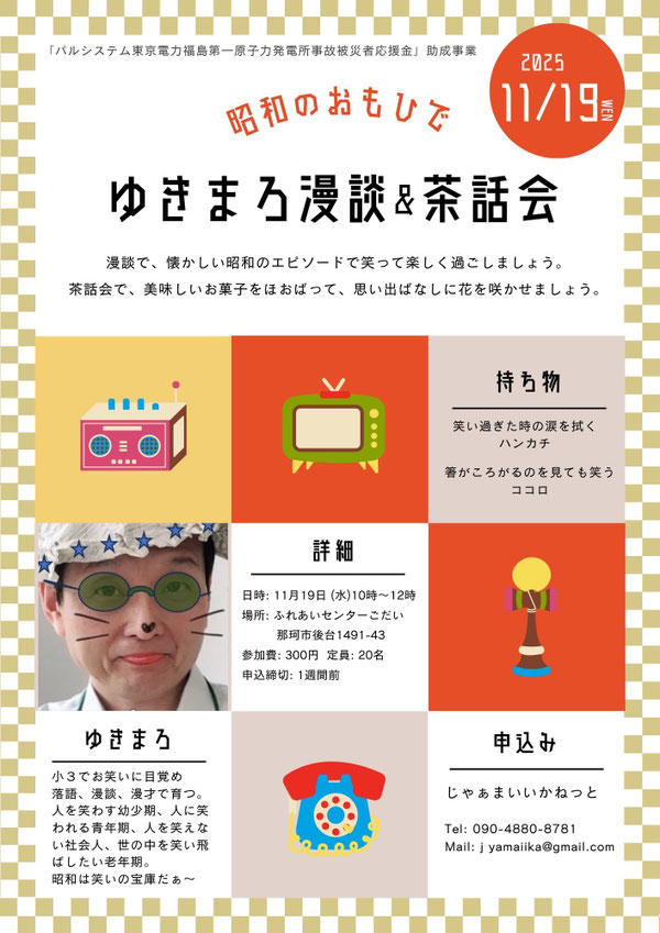 昭和のおもひで ゆきまろ漫談&茶話会 漫談で、懐かしい昭和のエピソードで笑って楽しく過ごしましょう。 茶話会で、美味しいお菓子をほおばって、思い出ばなしに花を咲かせましょう。 ■持ち物 笑い過ぎた時の涙を拭くハンカチ 箸がころがるのを見ても笑うココロ ■日時 11月19日(水)10時~12時 ■場所 ふれあいセンターごだい...