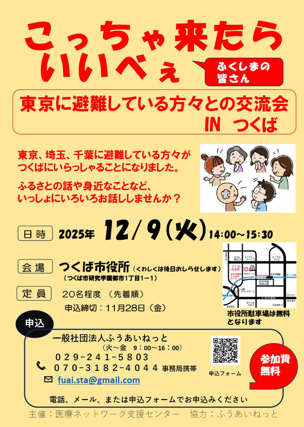 東京に避難している方々との交流会 IN つくば 東京、埼玉、千葉に避難している方々がつくばにいらっしゃることになりました。 ふるさとの話や身近なことなど、いっしょにいろいろお話ししませんか? ■日時 2025年12/9(火) 14:00~15:30 ■会場 つくば市役所(くわしくは後日おしらせします) (つくば市研究学園都市1丁目1-1)...