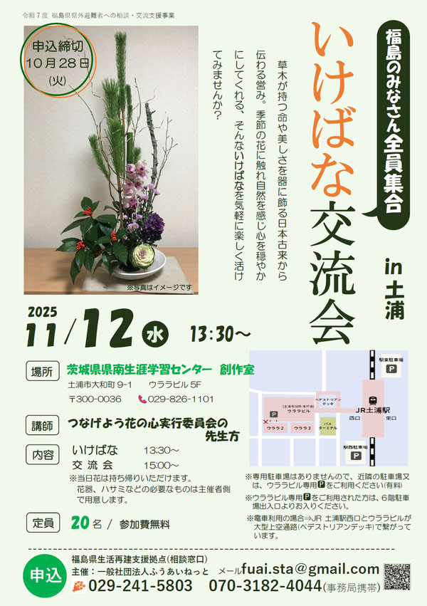 いけばな交流会in土浦 ■日時 2025年11月12日(水)13:30~ (申込〆切 10月28日) ■場所 茨城県県南生涯学習センター 創作室 〒300-0036 土浦市大和町 9-1 ウララビル 5F ■講師 つなげよう花の心実行委員会の先生方 ■内容 いけばな 13:30~ 交 流 会 15:00~ ※当日花は持ち帰りいただけます。...